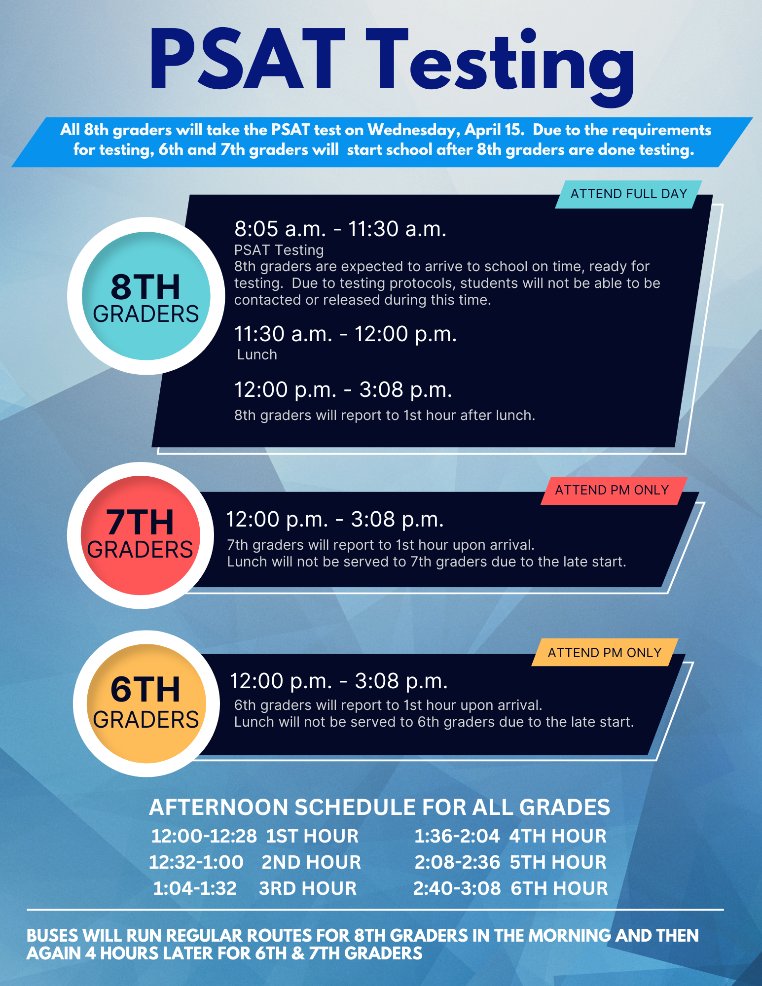 PSAT Testing - 8th graders 8:05 AM to 12:00 PMPSAT Testing - 8th gradersDate: Apr 15Time: 8:05 AM to 12:00 PMCalendar: Pierce Middle School